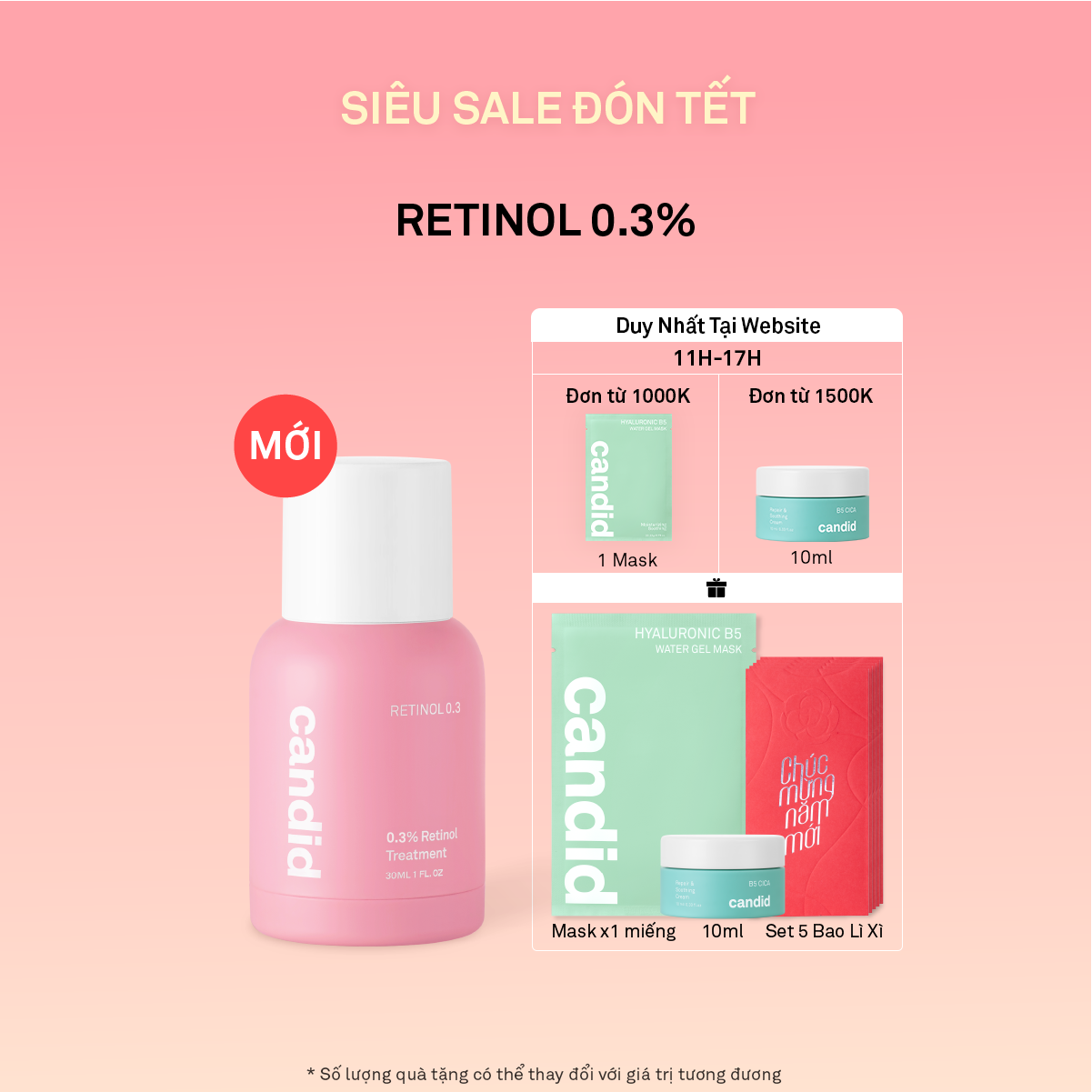 - Hoạt chất Retinol 0.5% 30ml là lựa chọn lý tưởng cho người mới bắt đầu, giúp da làm quen trước khi chuyển sang Retinol 0.5%. Giúp giảm các dấu hiệu lão hóa như nếp nhăn, da sạm, lỗ chân lông to, cải thiện kết cấu da căng bóng và mịn mướt. Cấu trúc sản phẩm dạng serum thấm nhanh, không bết dính, phù hợp mọi loại da.