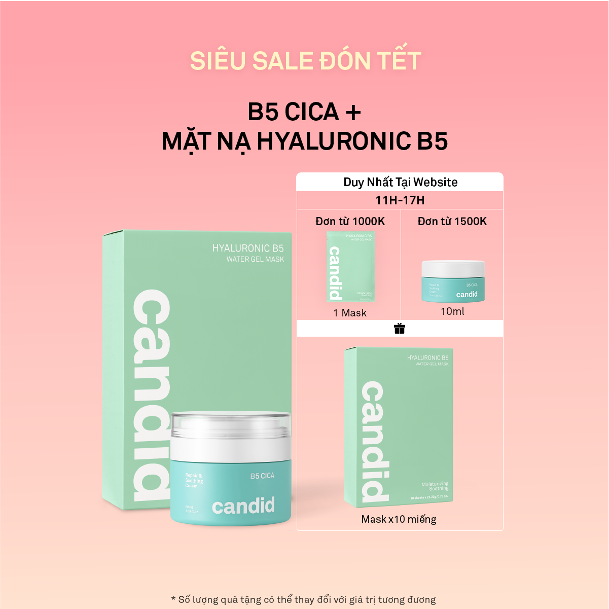 - Mặt nạ Hyaluronic B5 10 miếng: Thành phần gồm phức hợp 10 loại Hyaluronic Acid, Panthenol và Allantoin có khả năng dưỡng ẩm từ sâu trong da, đồng thời làm dịu, hỗ trợ phục hồi hàng rào bảo vệ. Phù hợp làm dịu và dưỡng ẩm phục hồi đối với các tình trạng da kích ứng, nhạy cảm hay khô ráp.